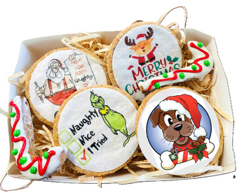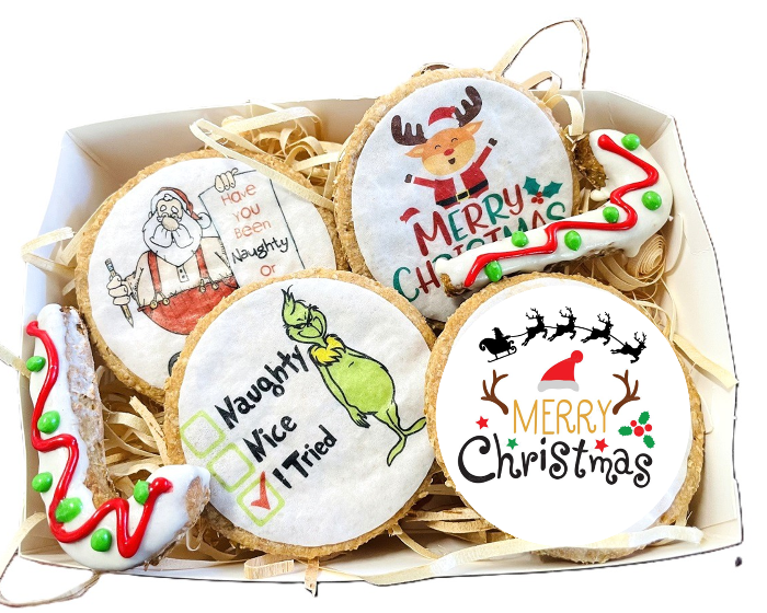 Festive dog treats made with wholemeal flour, cinnamon, and ginger. Includes four Christmas picture cookies and two candy canes. Store in a cool, dry place for up to six months.