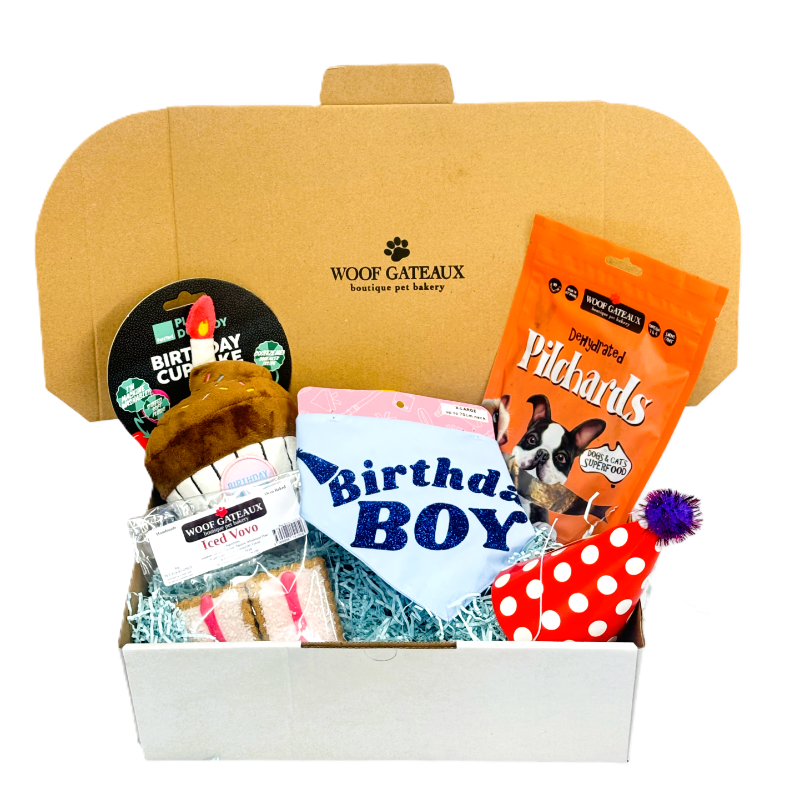 Pawty Pack is your paw-ty's ultimate present! It's a birthday box your pooch will paw-sitively love, with a special toy, a dapper birthday bandanna and hat, plus delicious treats like iced ruff ruffs and handmade cookies. Your pup will be looking (and tasting) amazing on their special day!